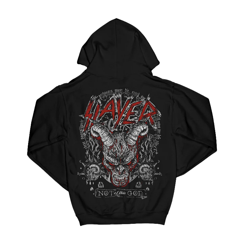 The Not of This God Hoodie comes from the 2010s, inspired by the same song featuring Baphomet along the lyrics "These apocalyptic predators must die. Everyone, till none are left alive it".