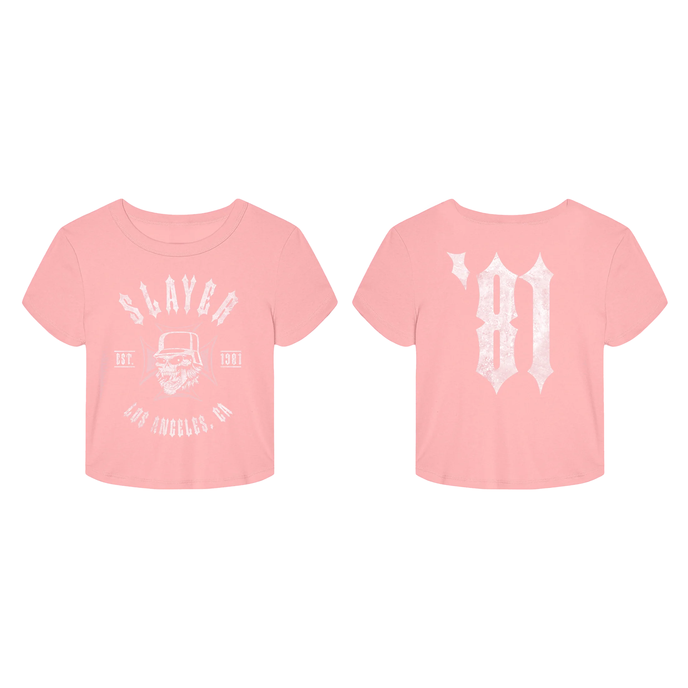 The Slayer '81 Pink Baby Tee features classic skull artwork and'81 back print in a light, washed-out white. Made from an ultra-soft, airlume cotton blend, it offers a vintage feel and slight stretch for everyday comfort with a punch of attitude.