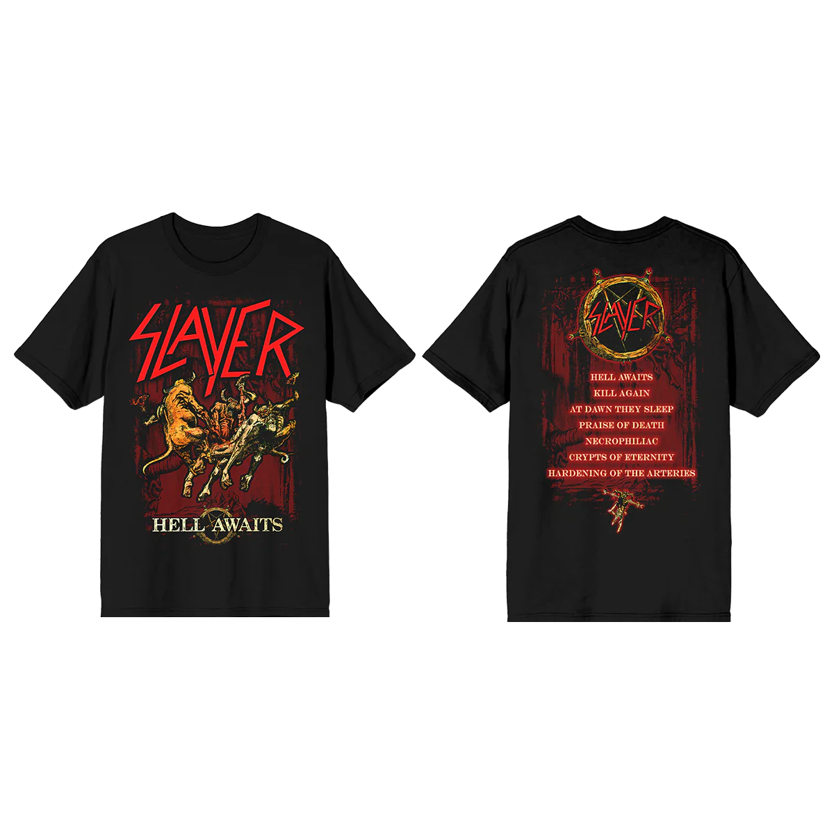 The Hell Awaits Album Cover Tee unleashes Slayer’s iconic 1985 album artwork across the front in full, fiery color. Turn around, and you’ll find the entire tracklist burned into the back like a warning from the depths.